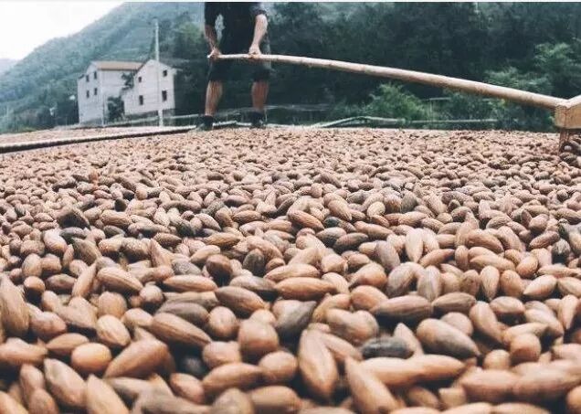 剥好皮后是晾晒。这一关很有讲究!堆20cm厚的表层不能让其失水,中下层又不能太湿,因此,必须根据湿度和温度的变化,时不时勤翻,上下轮换,以维持最佳状态。 这道工序需要忙碌二十多天天,为的是将果仁衣中含有的麻口单宁,全部转化为香榧的有益物质,提高香榧的营养价值。